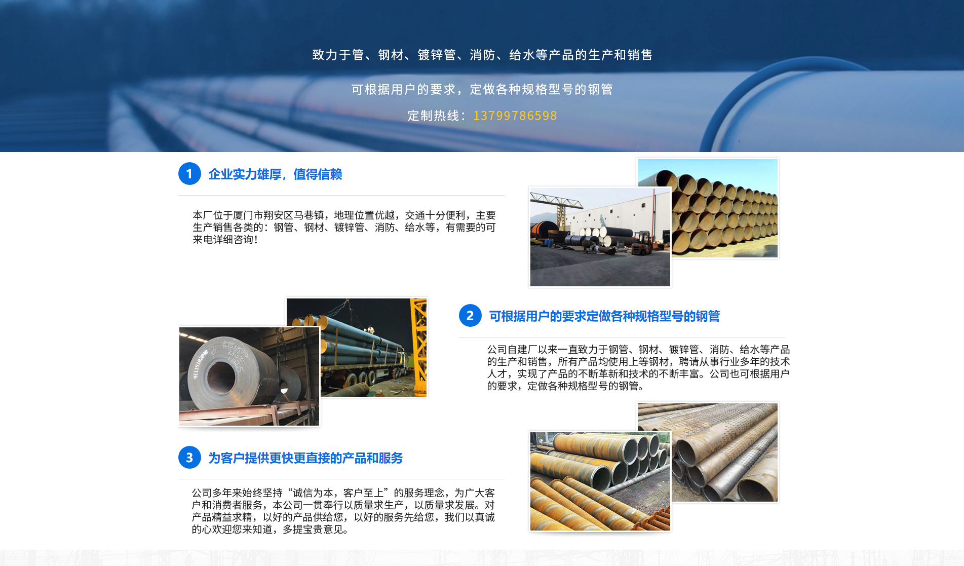 廈門方圓澤金屬材料有限公司主要生產(chǎn)銷售各類銀澤的:鋼管、鋼材、鍍鋅管、消防、給水等,產(chǎn)品被廣泛應用于天然氣、石油、化工、電力、熱力管網(wǎng)、水源等長距離輸送管道等,公司建立起了產(chǎn)品售前、售后服務(wù)規(guī)范,全過程滿足顧客要求,使我們的產(chǎn)品和服務(wù)深得顧客的信賴,與顧客建立起了長期合作互利關(guān)系。